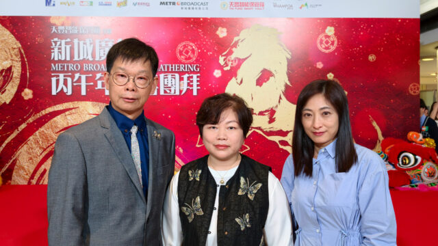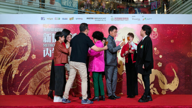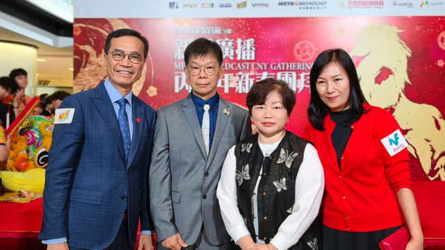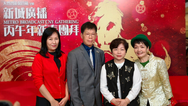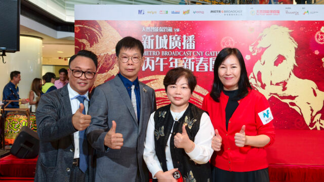 天豐集團 (環球) 有限公司創辦人兼主席蘇天助先生與夫人林婉陽女士,於新城廣播丙午年新春團拜活動上參與祝酒,並與新城廣播有限公司行政總裁馬浚偉先生,總經理(全渠道營銷及數碼業務)梁耀忠先生、新城財經台台長兼股評家魏美珍女士合影留念。