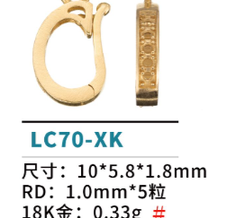 Purity 18K0.980g per item Width x Length 2x8mm0.980g per item Category: Lobster Clasp / Lobster LockProduct Details成色 / Purity 重量(一個) / Weight(One piece) 18K 0.98 14K 0.85 10K 0.75 9K 0.73 PT 1.29 銀 0.66